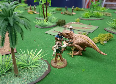 Okay to wrap up, a great game ensued and fun was had by all! The figures were great, the terrain looked good and the Event Markers worked as planned creating the story BUT there were a couple of points that need to be addressed if it is played again or if we play another large Pulp Action game using the Event Markers. First up, as play progressed players expected the Event Markers would only result in 'bad news' (not true!) so a couple started avoiding them, next time to ensure there is more interest in them they'll be a Prestige Point awarded to teams for each Event Marker investigated, in this game this could have given the Game to the Ladies or the Nazi's! Secondly half the players didn't reach the middle of the play area and because of this the old 1933 Camp Site was not investigated, so again to encourage this they'll be 10 Prestige Points awarded to the teams for reaching central locations, in this case the Temple and 1933 camp site, again enough points to have changed the result in this case. Lastly next time I plan a scenario of this type I won't have a huge impassable piece of terrain dominating the tabletop, the volcano was spectacular and really essential to the storyline but it prevented a lot of player interaction!